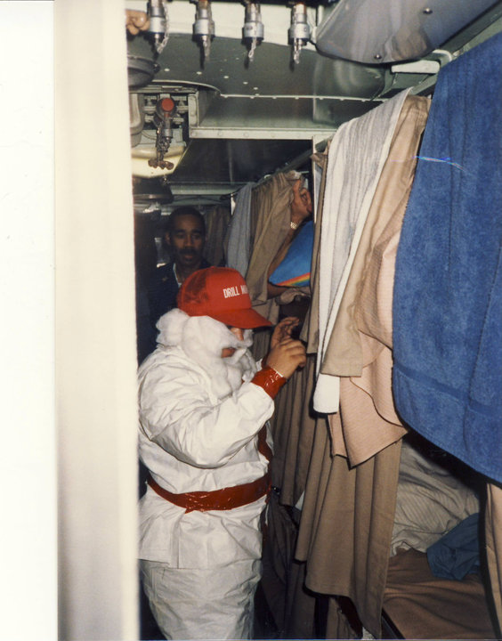 The 1986-87 deployment was the first of two times I was ever under way on Xmas Day. The nuc ET chief donned one of the white coveralls from the Otto fuel spill kit, trimmed with EB Red, and then added a red drill-monitor ball cap and an incredibly cheesy fake beard. He and the COB set out through berthing just after midnight local time, waking people up and passing out (if I recall correctly) candy.